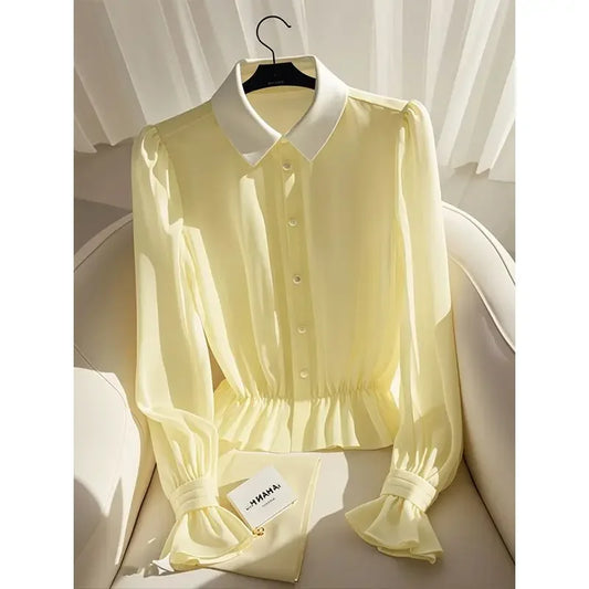 Vintage Pleated Blouse – Women’s Solid Color Long Sleeve Office Shirt